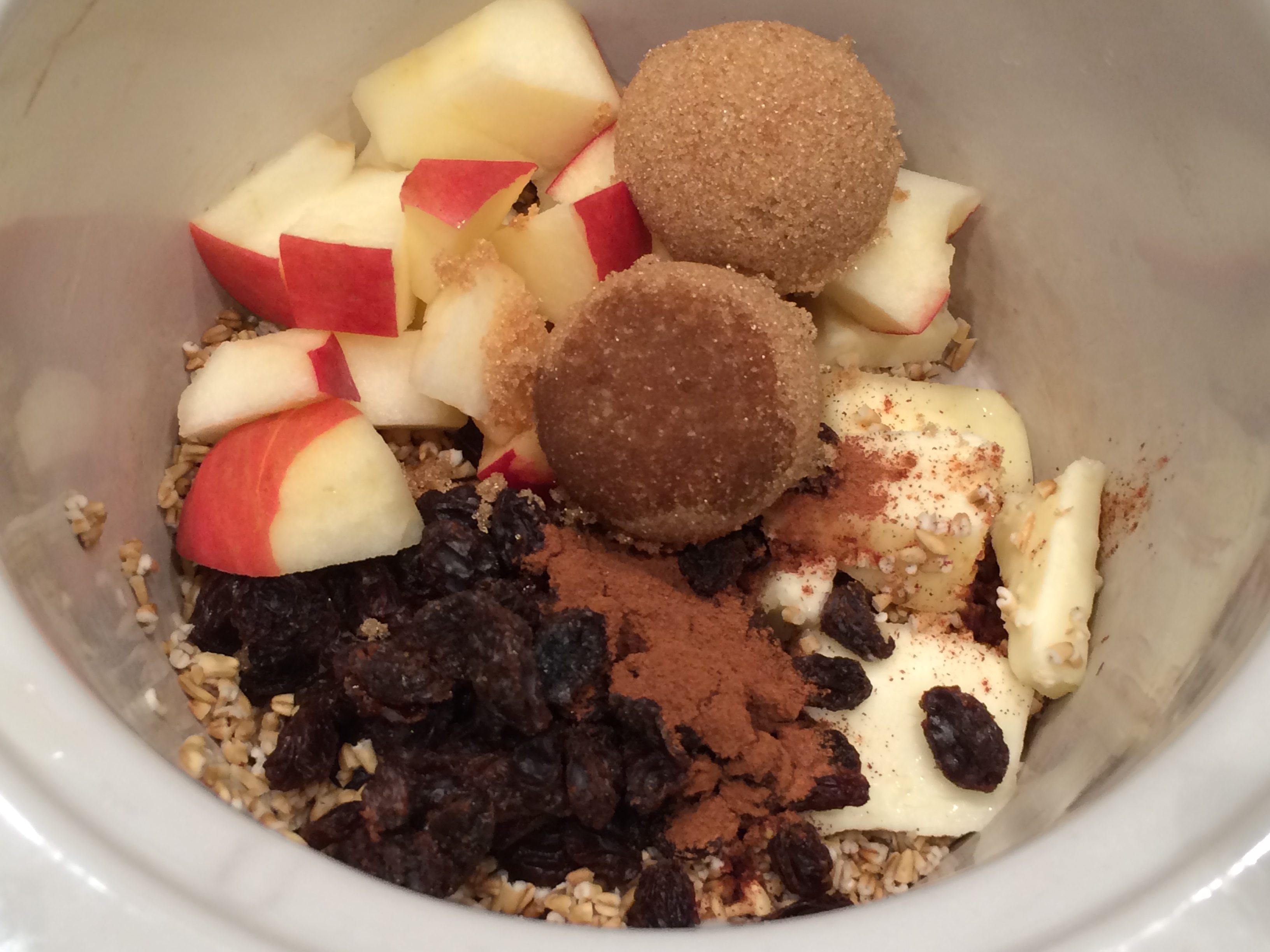 As much as I love to cook, I also like to keep it simple so I can enjoy family time too. We had already decided on oven cooked bacon and frittatas for breakfast. Both also easy but I wanted something extra to go with that. I searched the internet for ideas and found a slow cooker oats recipe on allrecipes’ website that inspired this recipe. Of course I altered the ingredients a bit to adapt more to our taste, but that’s where it all began. This is one of those recipes that you dump the ingredients in a slow cooker, cover with the lid, turn it on low and go to bed. The only prep work that needs to be done is chop the apple. It’s that easy.