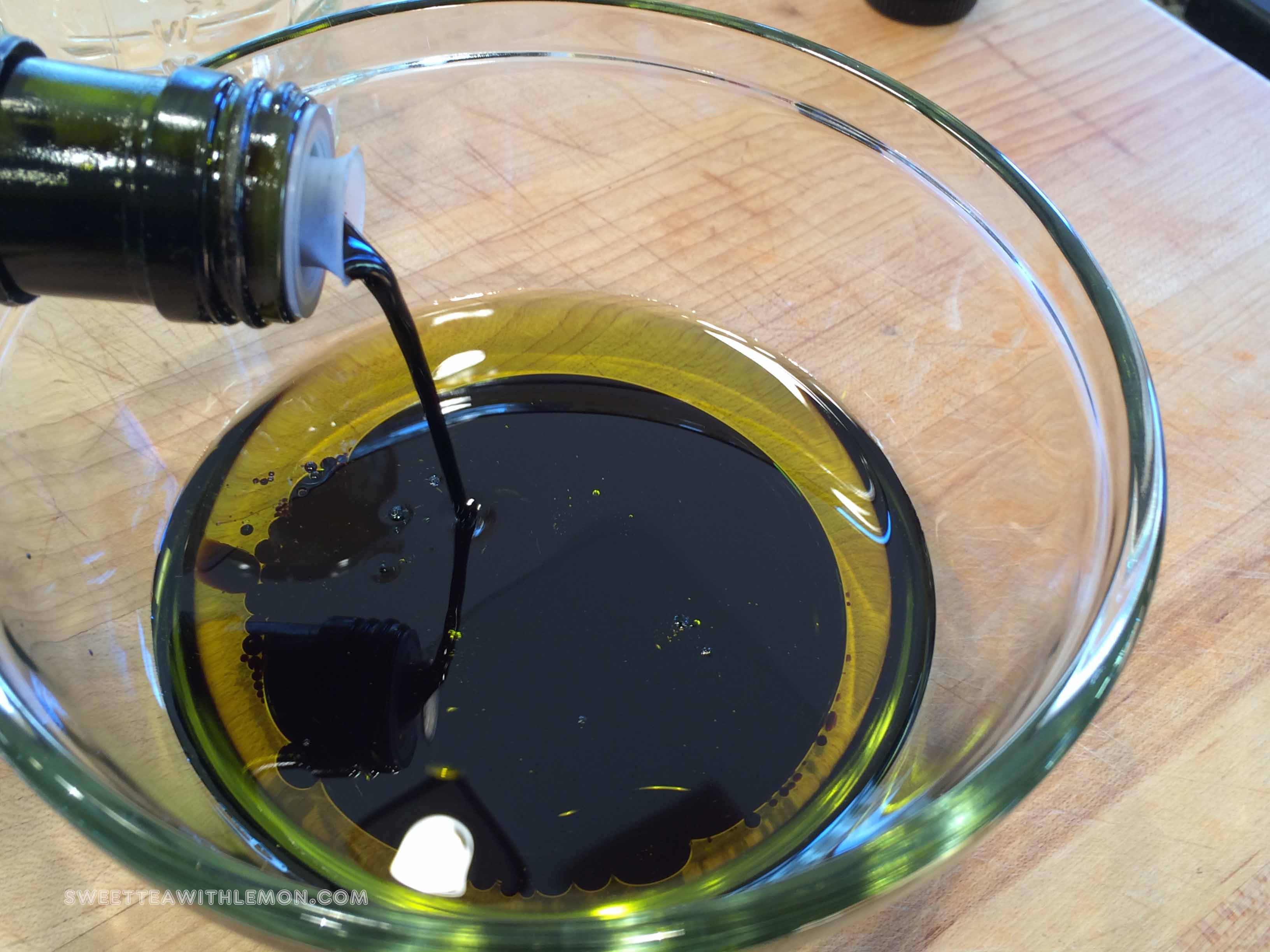 In a small bowl, pour the balsamic vinegar in with the extra virgin olive oil.