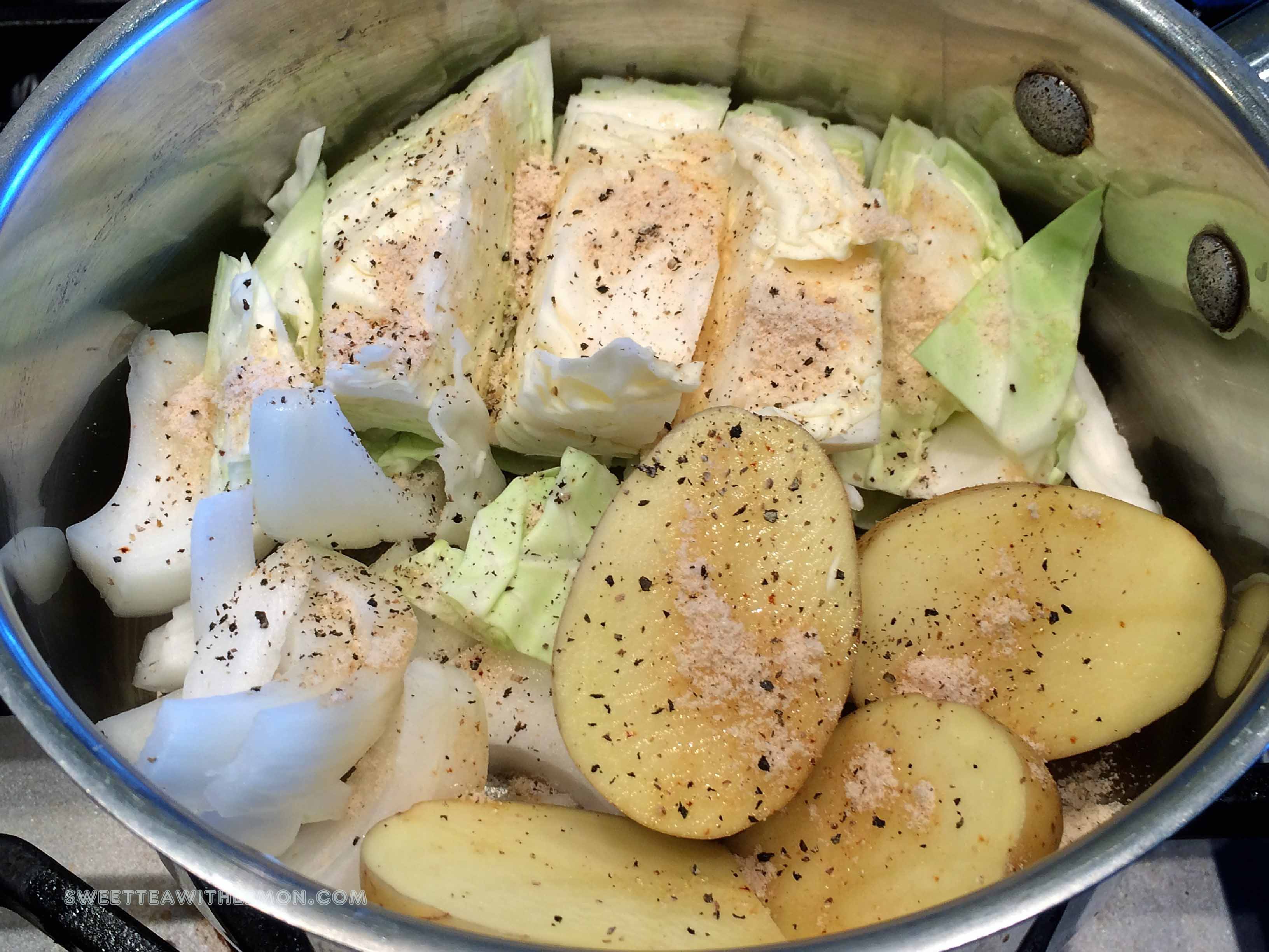- For preparing the vegetables, cut a chunk off of the cabbage head and cut it into large pieces, about 1 inch slices, throw into a medium size pot fitted with a lid.