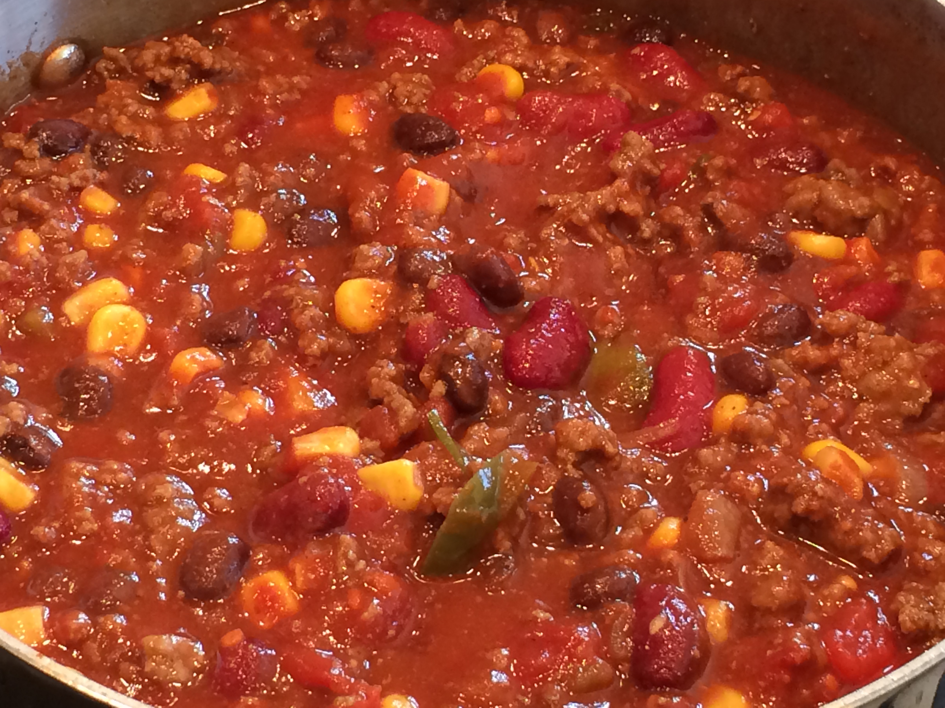 On a cold snowy day, I love a big pot of soup, stew or some kind of chili. This is a nice thick hearty chili chocked full of meat, beans and corn is a favorite of mine. It can simmer on the cook top, or in a slow cooker all day. Plus it freezes perfectly for those weeknight meals when you need something quick.