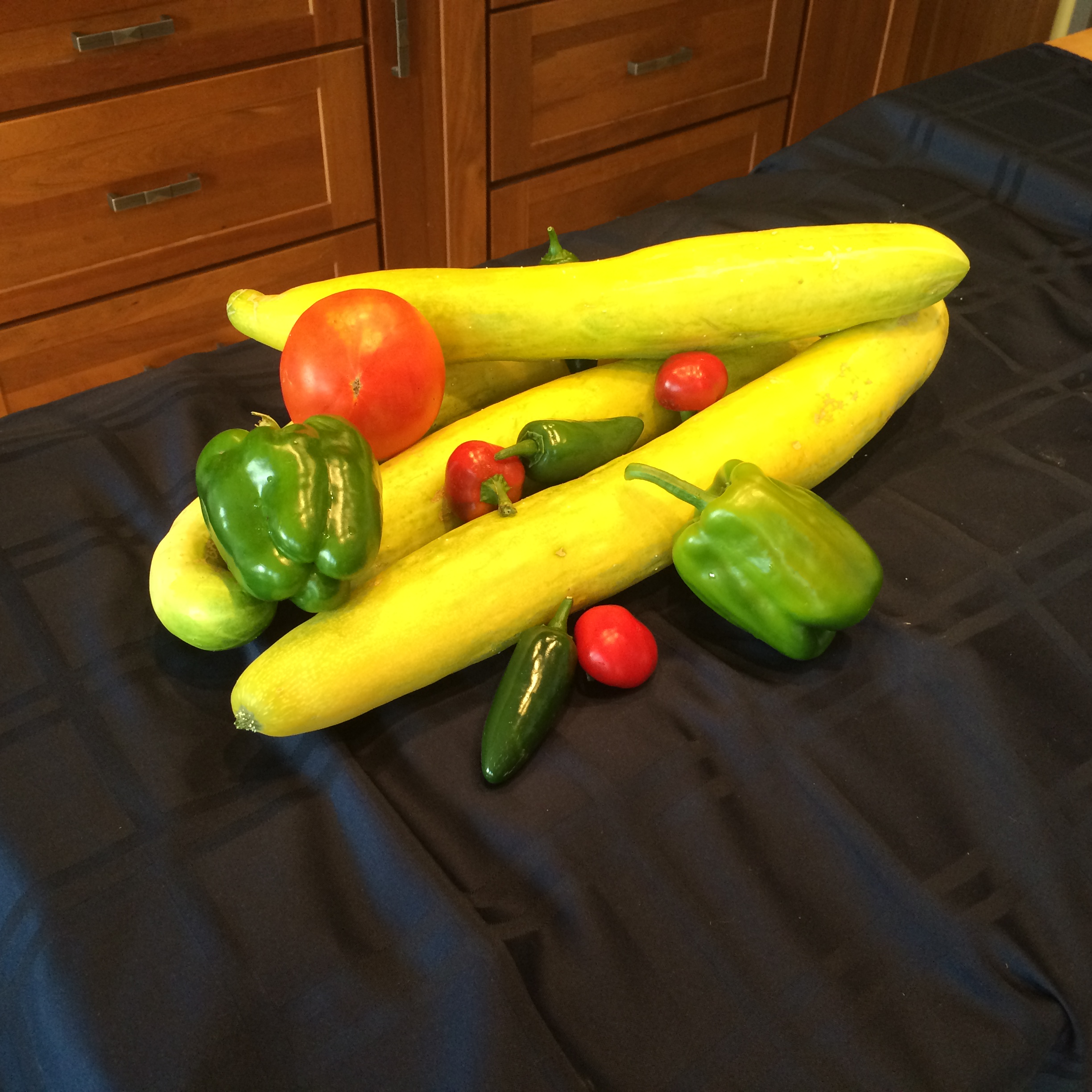 I do enjoy my little garden. Truly little garden. I grow a few tomato plants, a couple of cucumbers, and lots of peppers, both hot and sweet. Well, there are my herbs too, but that’s pretty much it in terms of gardens that we can eat. Last weekend I went out to check on my garden, I picked these big yellow overgrown cucumbers. The other vegi’s kinda give you a perspective of how long they were. Well, with the help from one of my jalapenos, I couldn’t help but add a little tape measure to the one on the right…