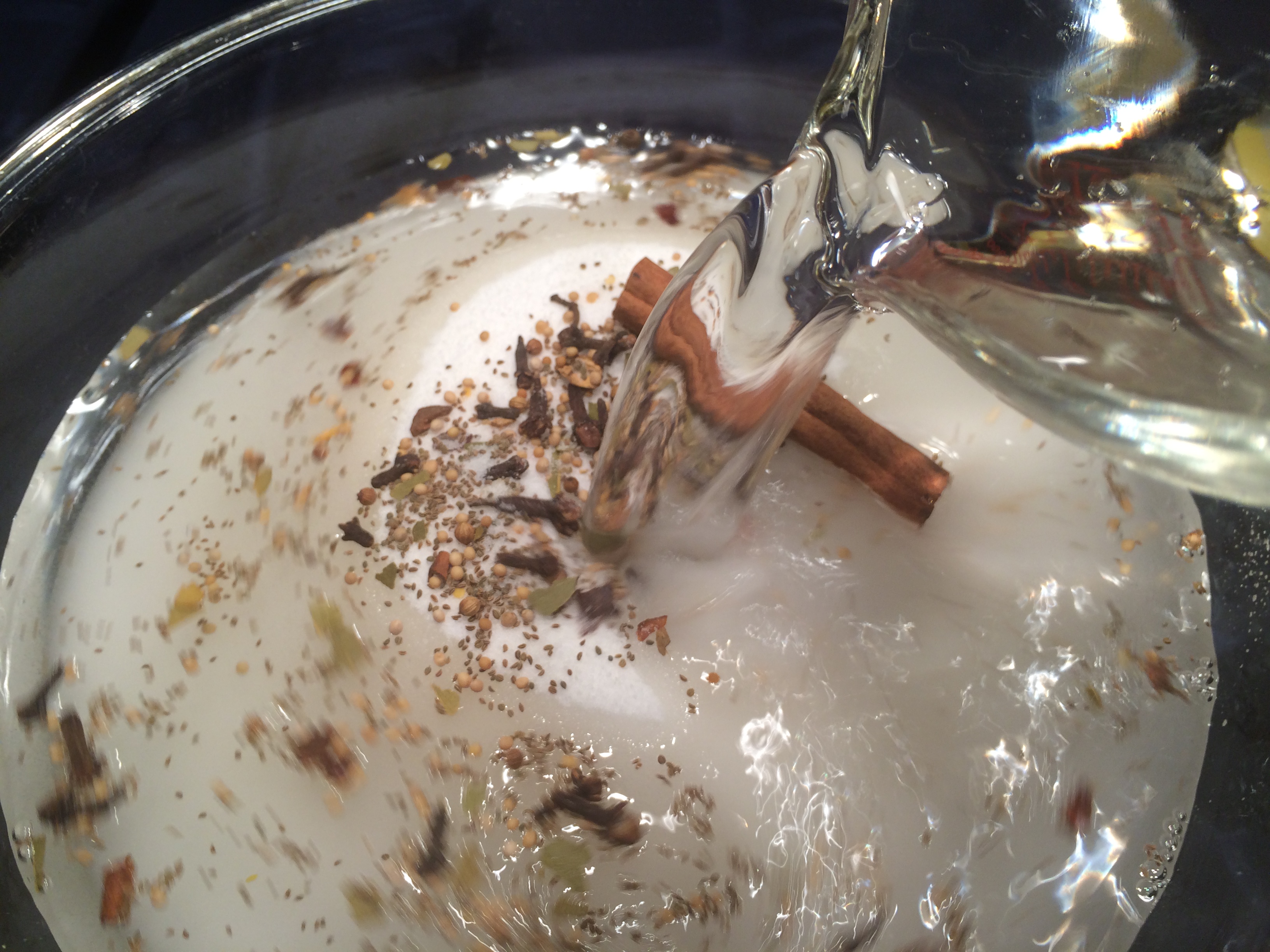 At the 3 hour mark, drain off the ice water. Pour in the spice solution, cover and let stand for 12 hours. Stir a few times just to keep it interesting…