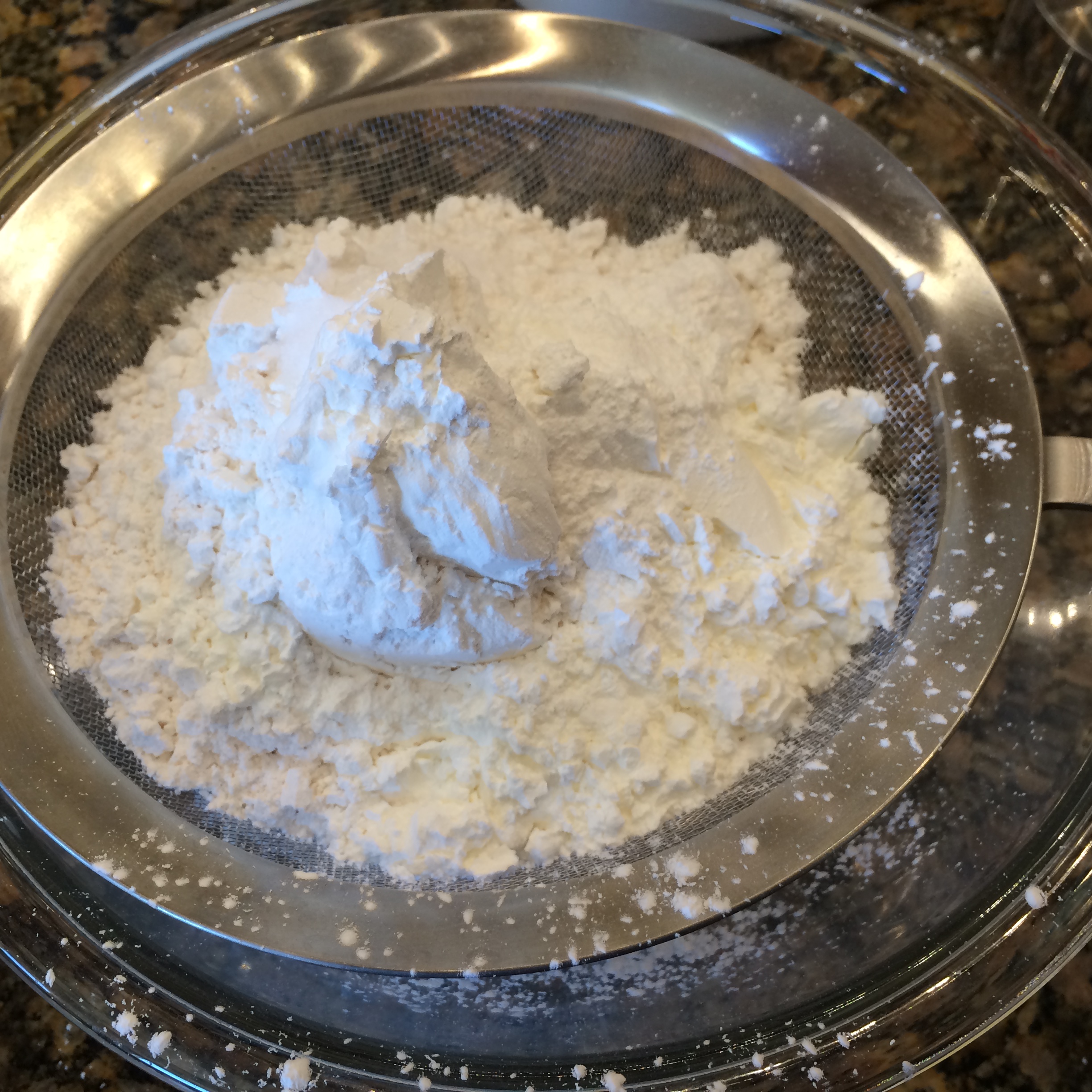 - Sift the flour, cornstarch, salt and baking powder together with a sifter or a wire whisk to combine and break up any clumps of flour. Set aside.