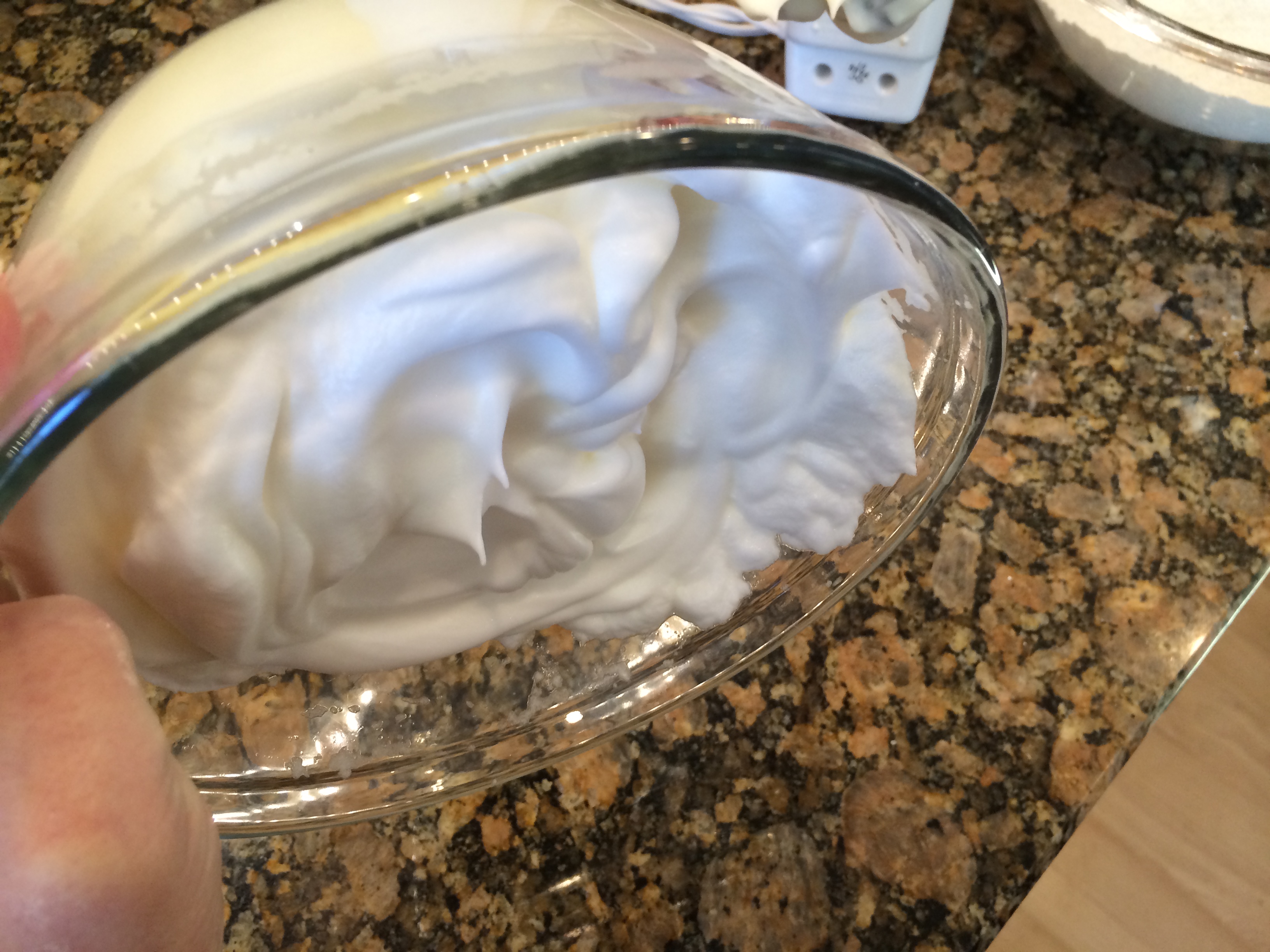 - With a hand held rotary mixer, beat cold egg whites until stiff peaks form and fold into the batter, careful to not deflate the egg whites.