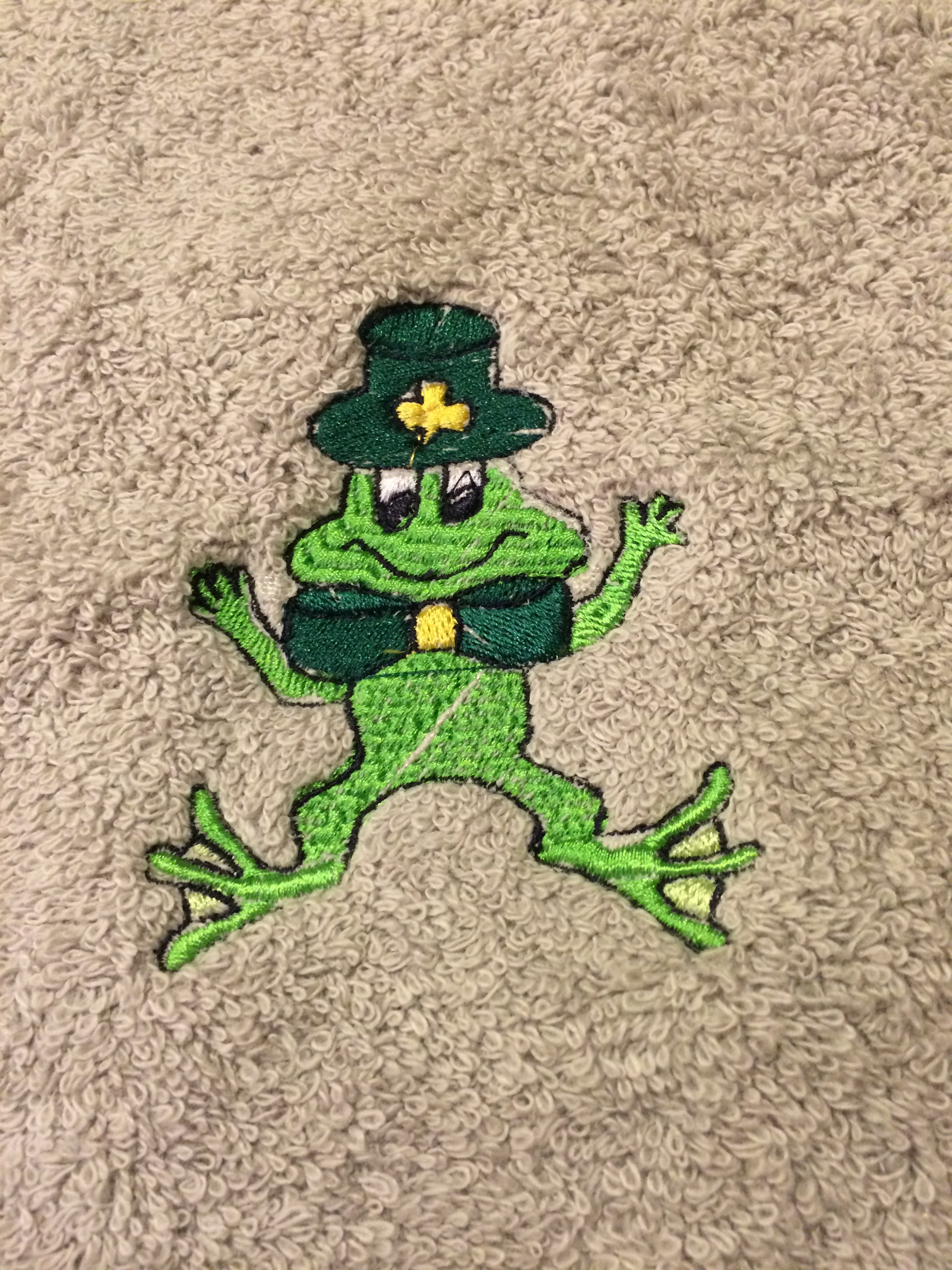 We have another friend that is Irish and her birthday is near St. Patrick’s Day and I decided to have a little fun with that. I did a light grey hand towel with a St. Patrick frog on one end of the towel and her monogram with a clover on the other.