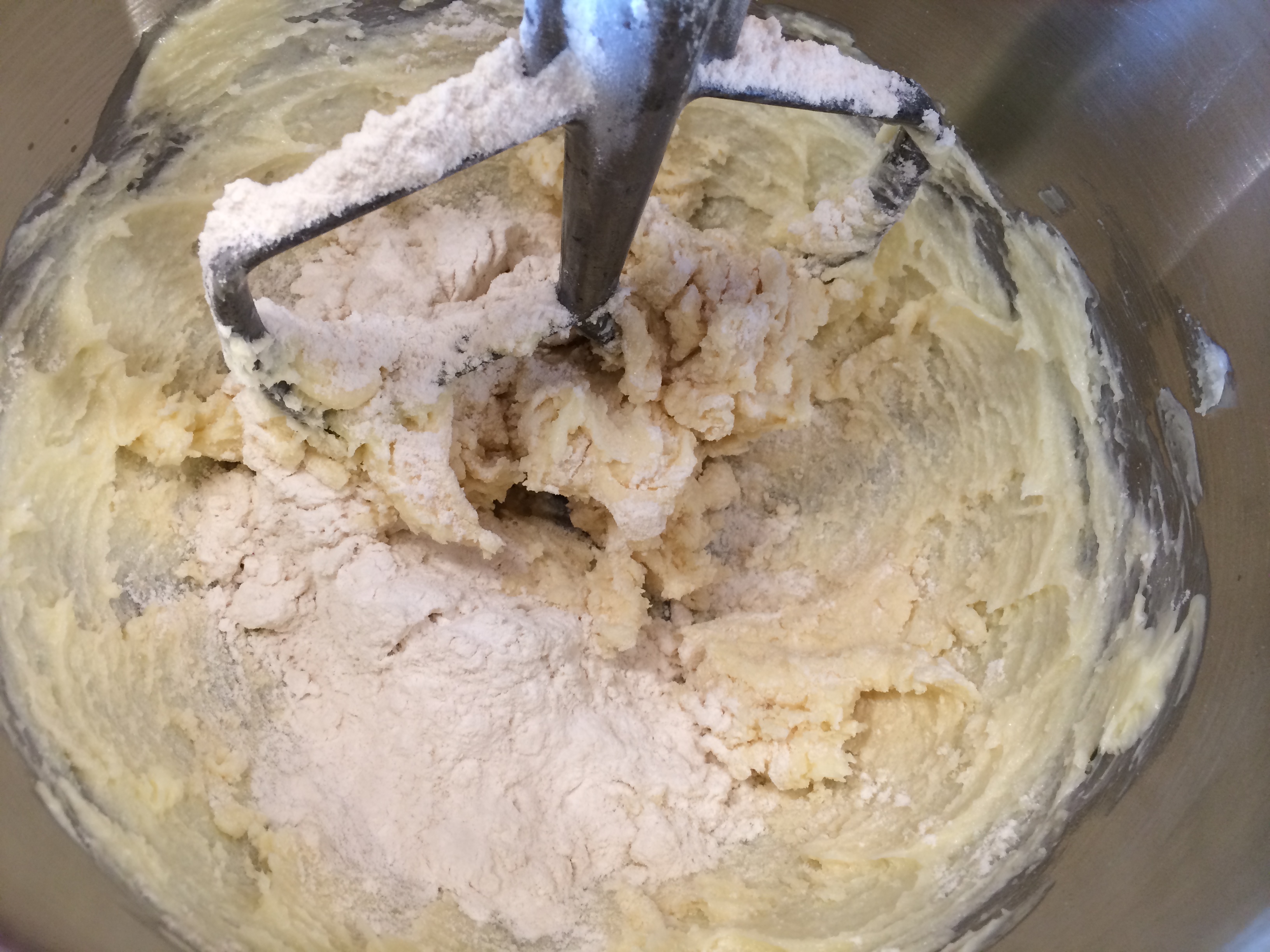 Traditionally, you sift together the flour and salt in a bowl. I have a sifter in the cabinet, but for some reason I just don’t like having to sift! The whole idea behind sifting is to get the chunks of flour broken up and make it smooth. I tend to take the lazy way and use a wire whisk to mix it together, plus It’s easier to clean! After whisking (or sifting, if you prefer) add the flour and salt to the butter mixture and combine on LOW speed, unless you want to wear some of the flour as proof of baking.
