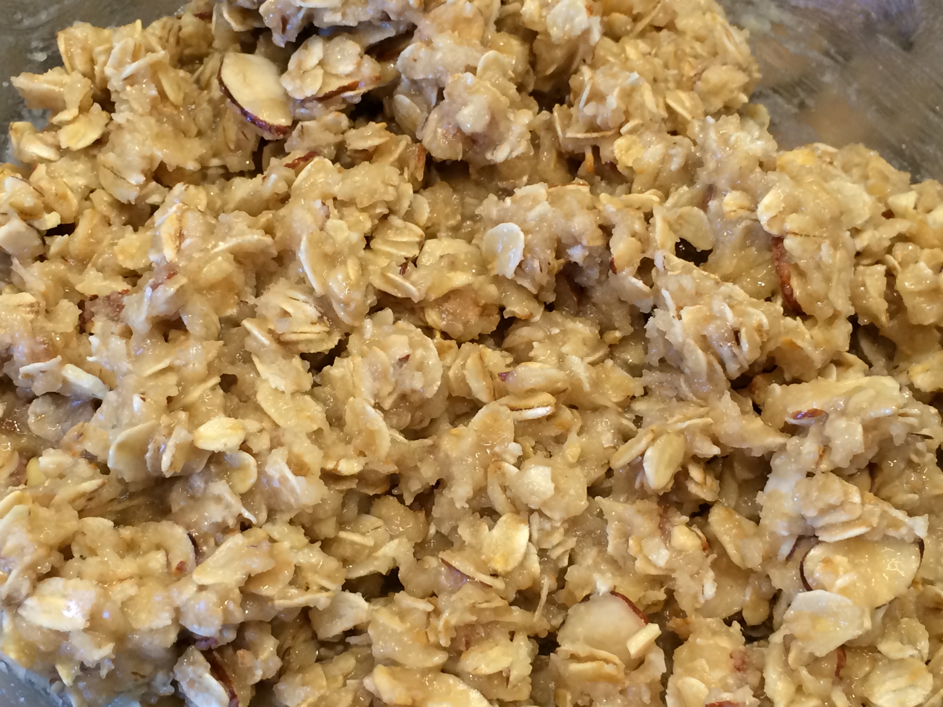 Now, let’s make the delicious oatmeal and almond topping. My original recipe uses this for both the top and bottom crust. But, for these bars, I only make enough for the top.