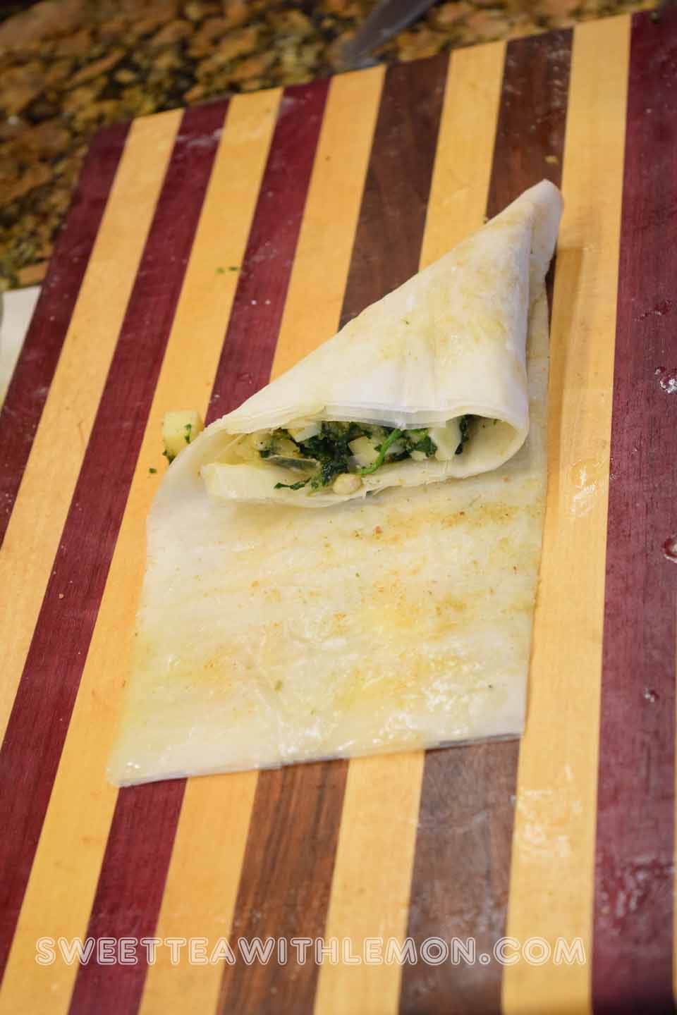 - Turn the cutting board so the short end of the phyllo dough with the spinach mixture is nearest to you. Fold one corner over the spinach mixture so the short end of the phyllo dough is lined up with the long end to form a triangle. Then fold that triangle straight down the phyllo dough and keep folding in both directions until you get to the last fold. It's like folding a flag. Butter the last fold to serve as the glue to hold it together. The spinach filling should be totally contained.