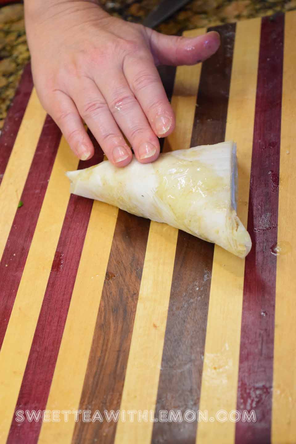 Here you can see how I fold each one. Turn the cutting board so the short end of the phyllo dough with the spinach mixture is nearest to you. Basically fold one corner over the spinach mixture so the short end of the phyllo dough is lined up with the long end to form a triangle. Then fold that triangle straight down the phyllo dough and keep folding until you get to the last fold. It’s like folding a flag. Butter the last fold to serve as the glue to hold it together. The spinach filling should be totally contained.