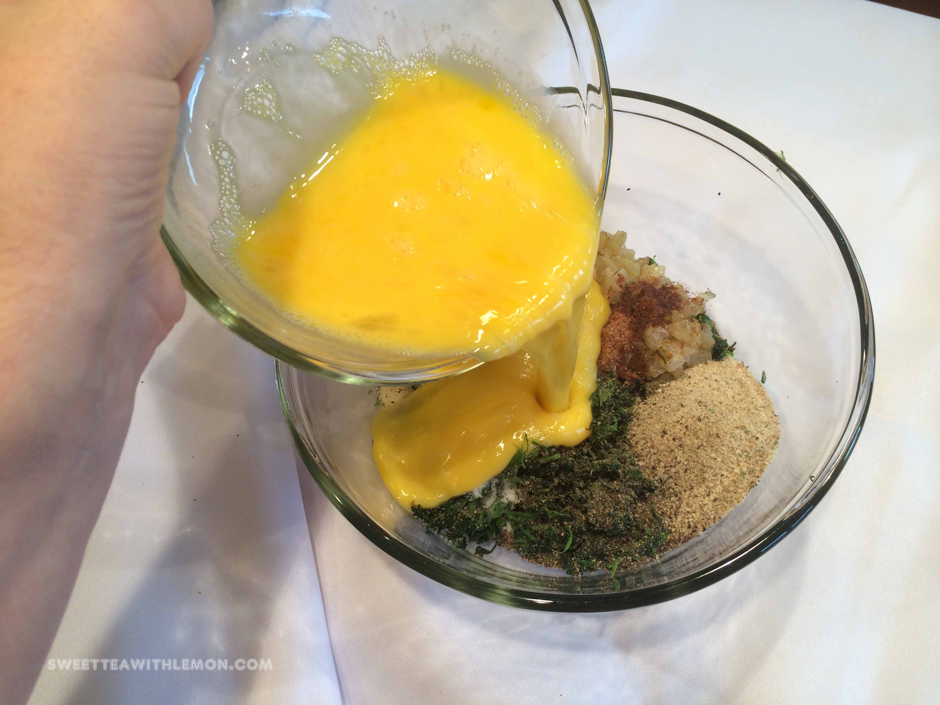 Add the onions to the chopped spinach along with the Parmesan cheese, bread crumbs, nutmeg, salt, fresh cracked pepper, and lightly beaten eggs.