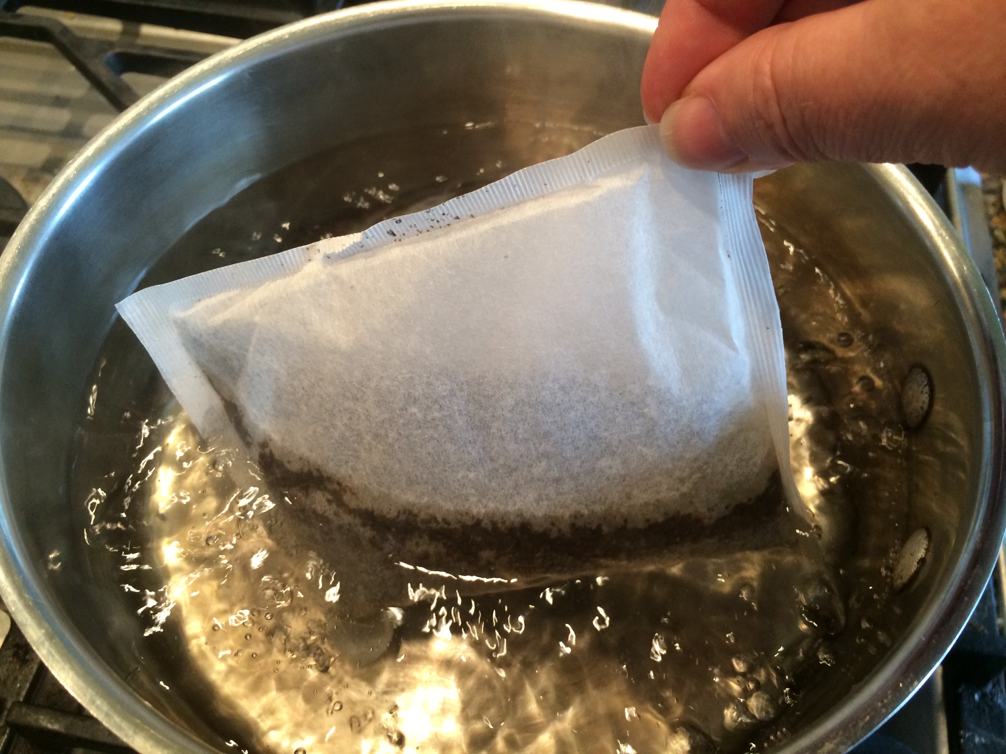Carefully remove the giant tea bag and gently squeeze out the excess water back into the pot. If it’s too hot to touch, use a pair of tongs to squeeze that giant baby. Again, just be gentle or it will tear.